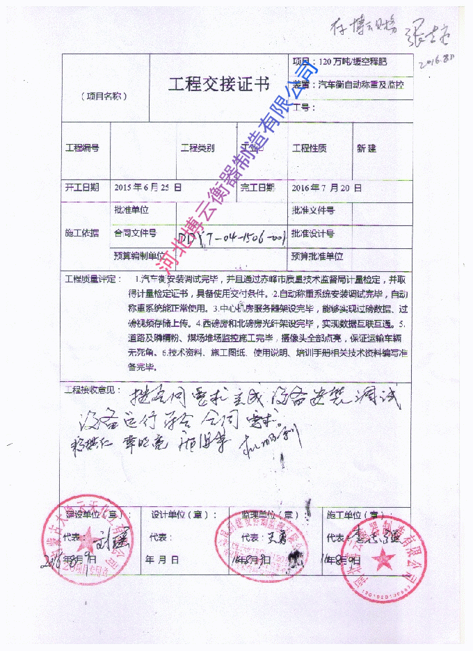 汽車衡稱重系統項目驗收合格 工程交接證書